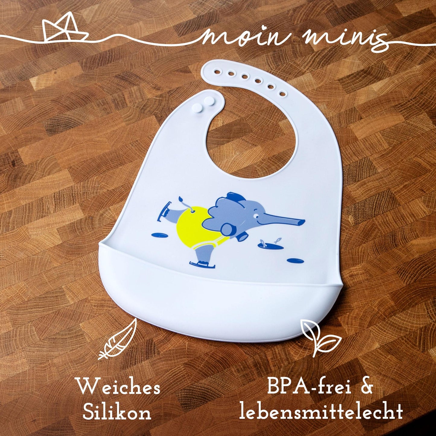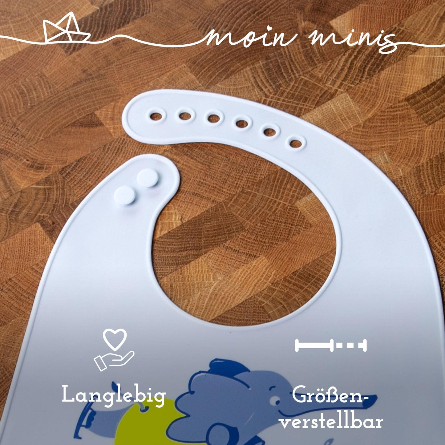 Due to the adjustable neck buttons, the silicone bib grows with your child and is suitable for babies from 3 months to the age of 6.