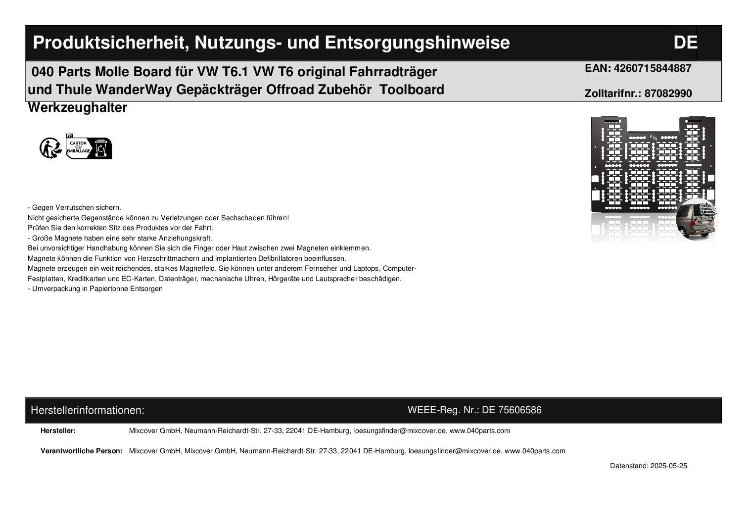 040 Parts Molle Board for VW T6.1 VW T6 original bike rack and Thule WanderWay roof rack Off-road accessories Toolboard tool holder