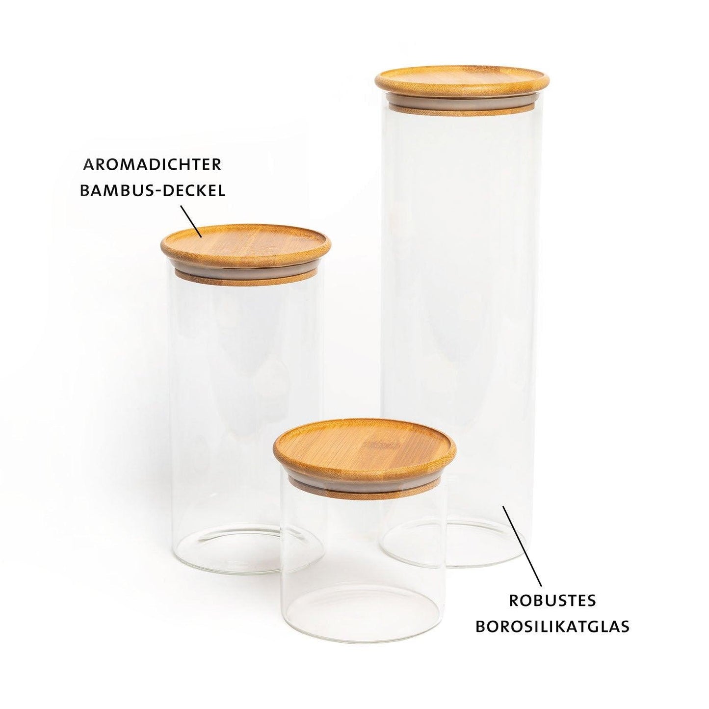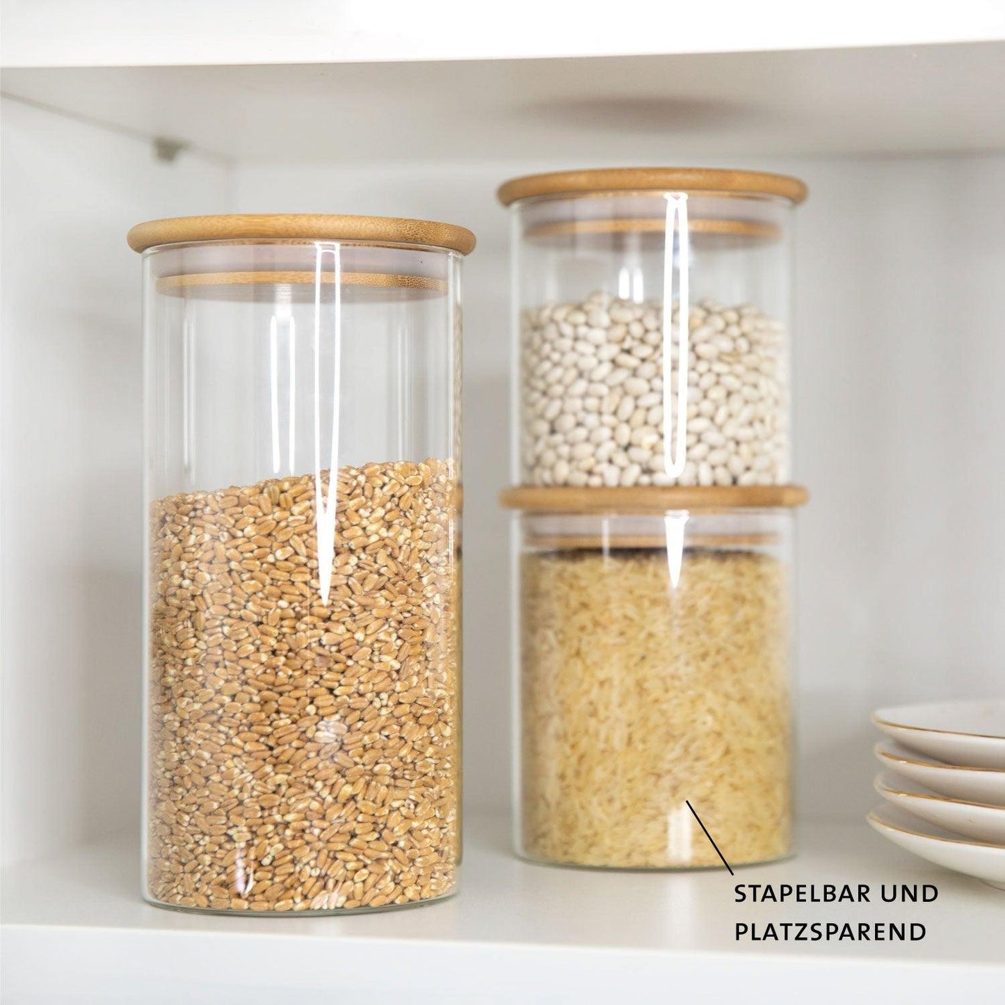 Many things often make life easier. Why not something practical for the kitchen too? It is also important for the kitchen to have the right and, above all, practical kitchen helpers at home. Even one or two devices can save a lot of time and stress in the kitchen. These storage jars will keep the kitchen tidy. The storage jars are available in different sizes, so that spaghetti, muesli, rice or flour will all find their place. The jars are made of borosilicate glass and are therefore particularly robust. The lid is made of bamboo and has a recess so that the jars can be stacked.