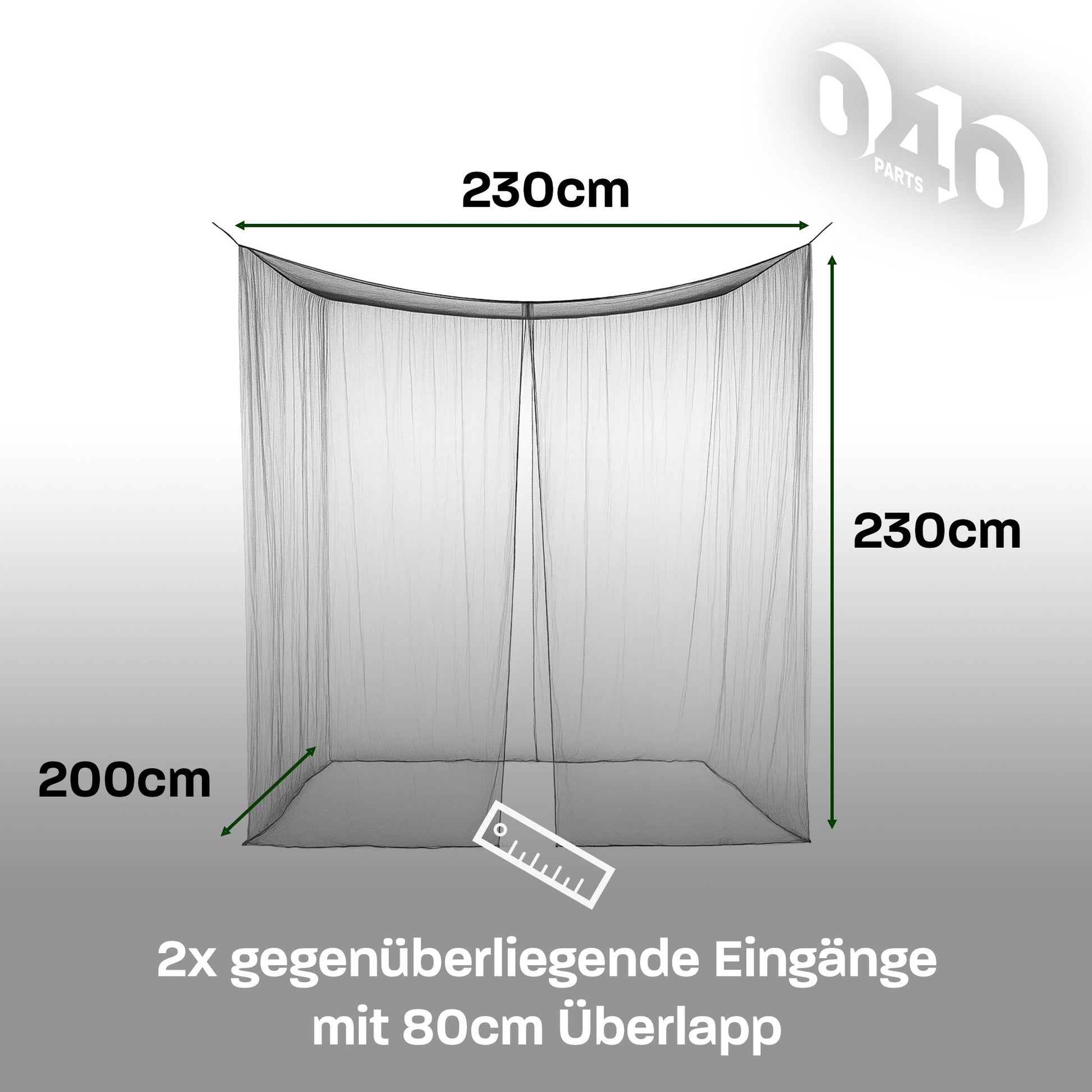- Zwei gegenüberliegende Eingänge: Jeweils mit 80 cm überlappenden Stoffnetzen für komfortablen Zugang von beiden Seiten bei maximalem Schutz.
