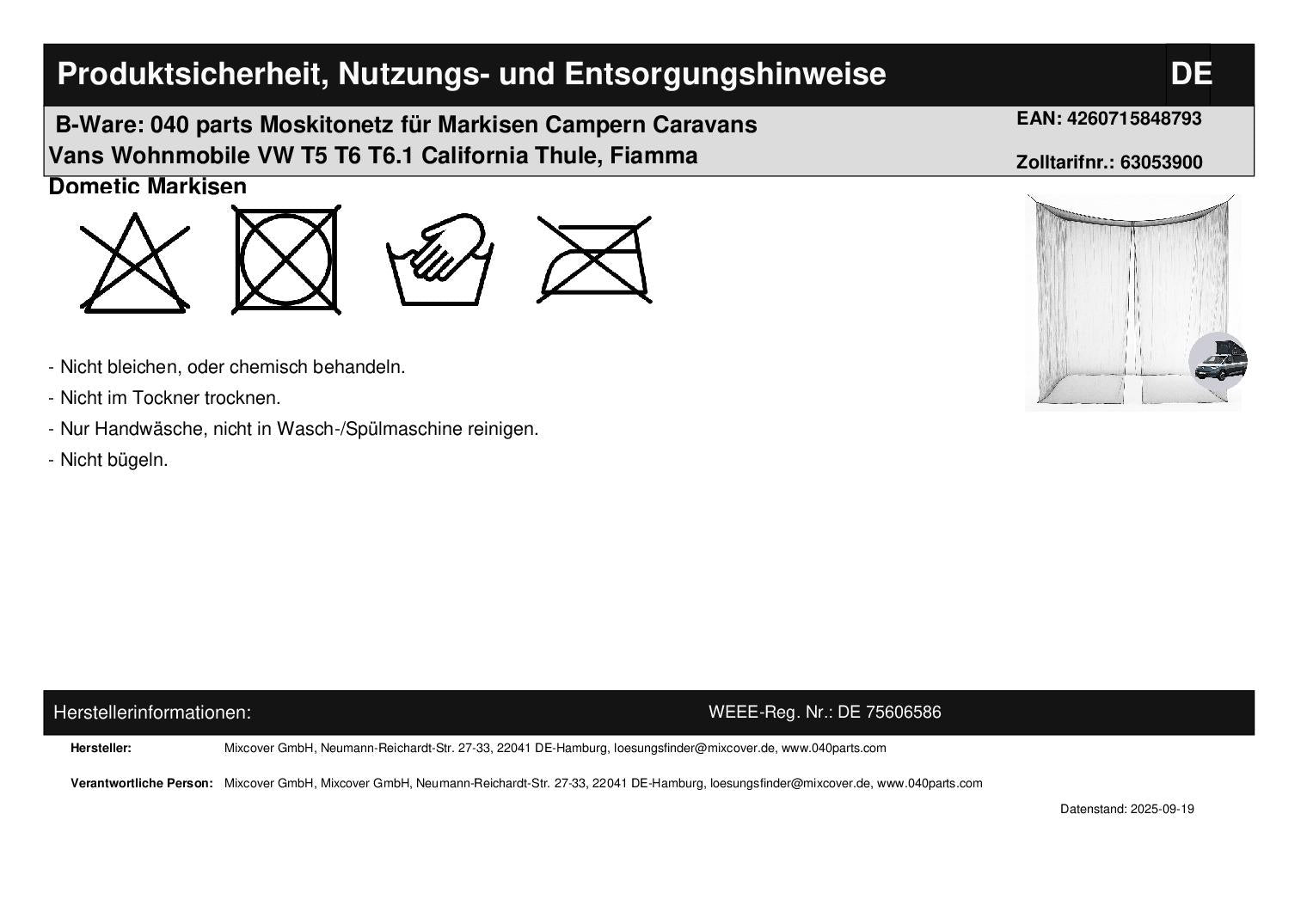 B-Ware: 040 parts Moskitonetz für Markisen Campern Caravans Vans Wohnmobile VW T5 T6 T6.1 California Thule, Fiamma Dometic Markisen
