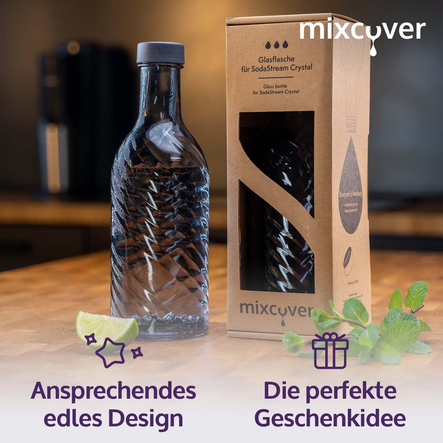 Die formschönen und außergewöhnlichen Designer Glasflaschen von mixcover sind in zwei unterschiedlichen Farben und mit 0,65 l Fassungsvermögen erhältlich.