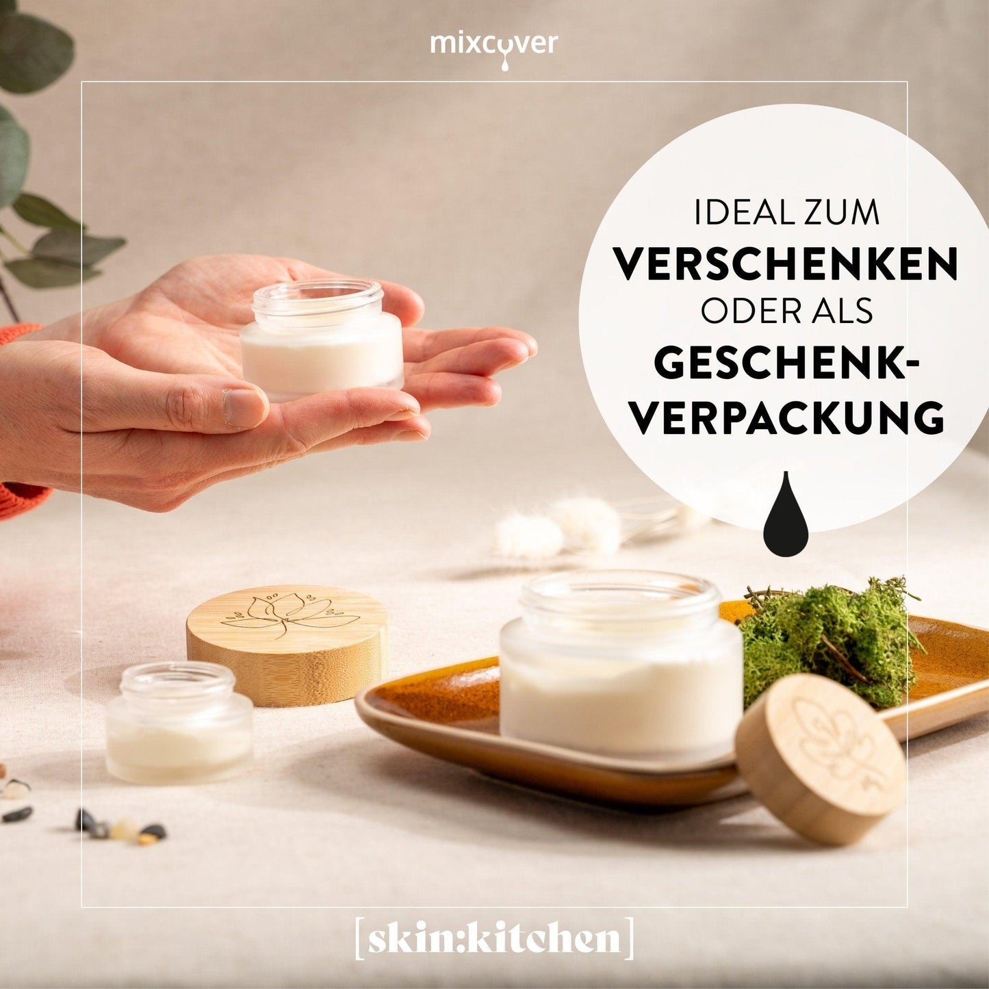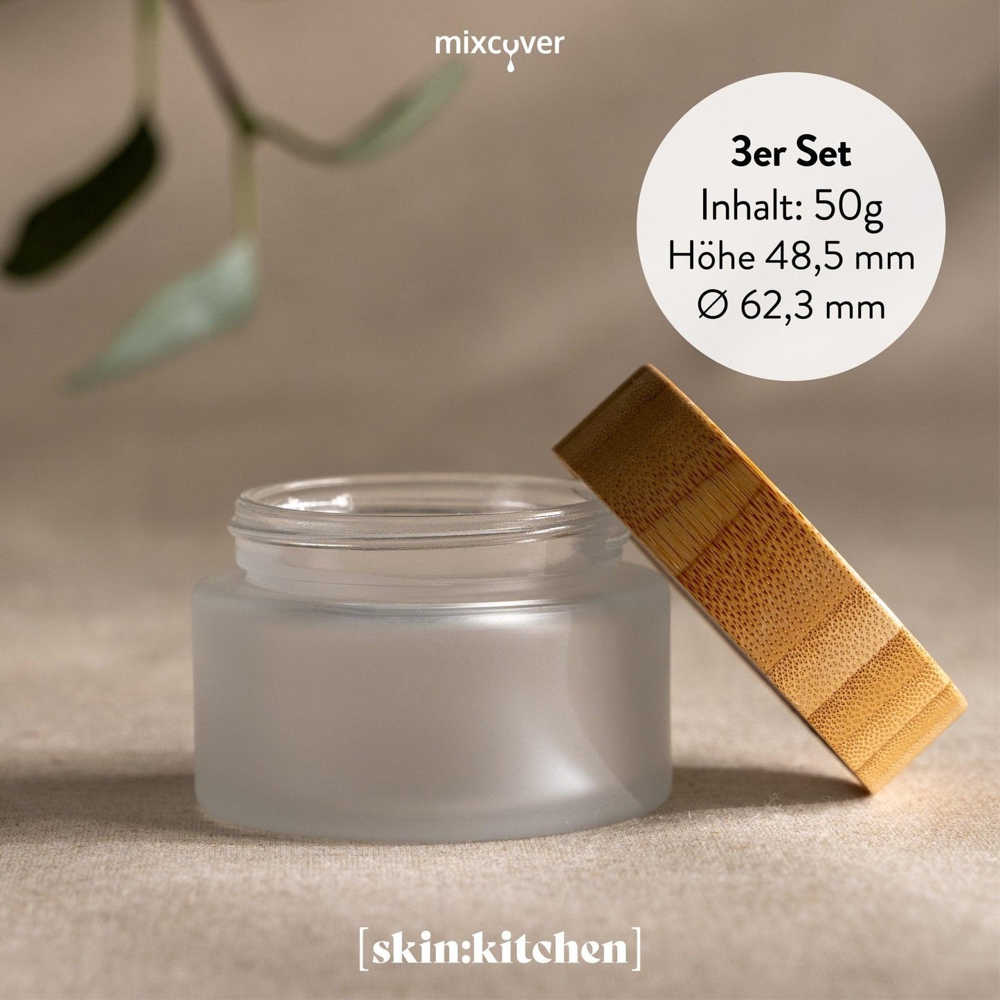 B-Ware: Glastiegel mit Bambusdeckel & Gravur für selbstgemachte Kosmetik 3er Set 50g Frosted