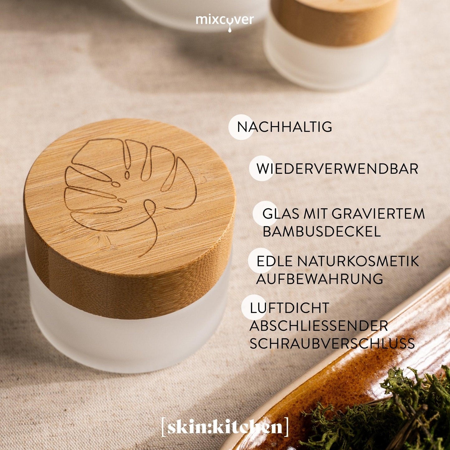 - 3x 50g Glastiegel frosted mit Bambusdeckel und Monsterablatt-Gravur
