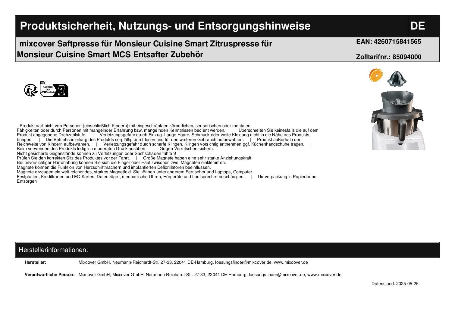 mixcover Saftpresse für Monsieur Cuisine Smart Zitruspresse für Monsieur Cuisine Smart MCS Entsafter Zubehör